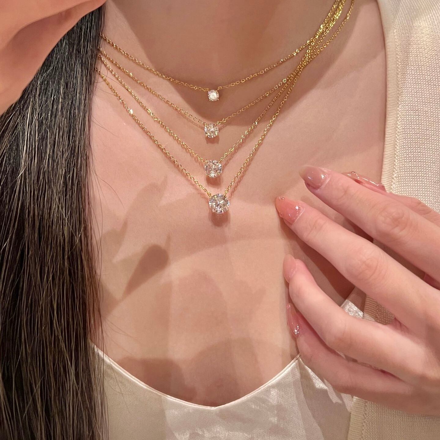 チェーンの中央に石を固定する両吊りデザインでデコルテに自然に沿い、どの角度から見ても美しいバランスに。