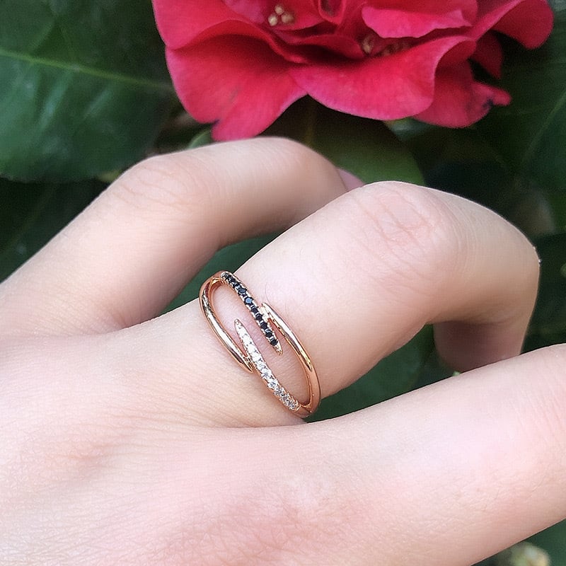黒ダイヤの輝きとエレガントなローズゴールドが絶妙に組み合わさり、シックでありながら個性的な印象を与えます。