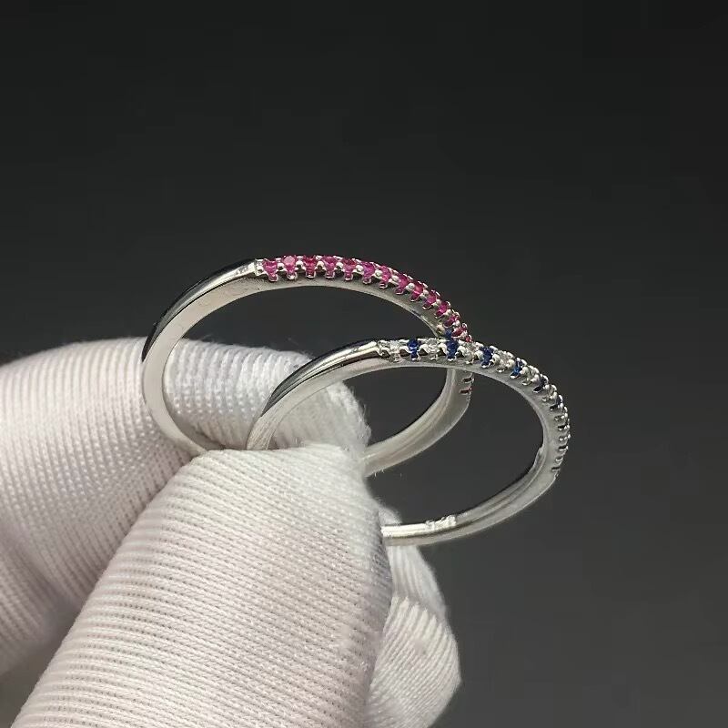 リング アレルギー対応 ピンク ルビーカラー CZダイヤ S925 シルバー コーティング 一文字 ハーフエタニティ